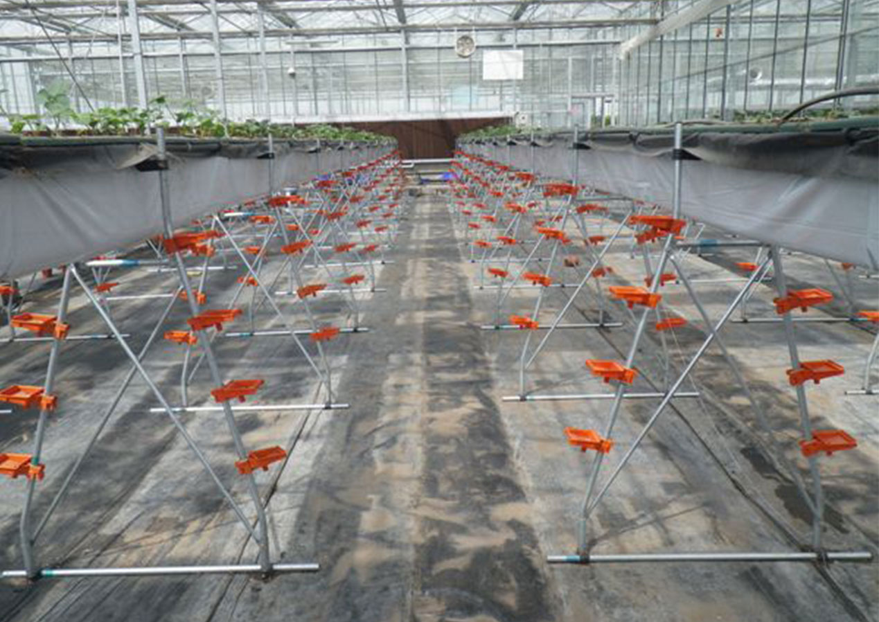 以镀锌管件为受力载体,将母株苗置于结构顶端,子苗盘成阶梯式分层放置,且对称布置于支架两侧,是一种能最大限度提高土地利用率,改善作业舒适度、提高经济效益以及最大限度利用温室空间和太阳光照的新型草莓育苗装置。
