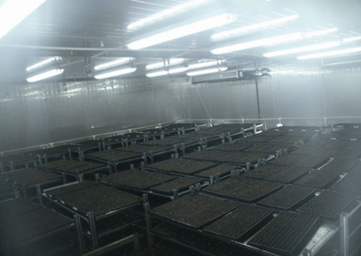 适用于专业化、集约化、规模化蔬菜育苗生产企业。可实现穴盘苗种子的快速催芽和批量 化生产,可根据种子发芽需要进行升温、降温和加湿调控,可定制穴盘架层间高度和催芽 容量,可实现全自动物流进出。精准的环境控制系统,可嵌入基于种苗生产的全程生产管 理系统。