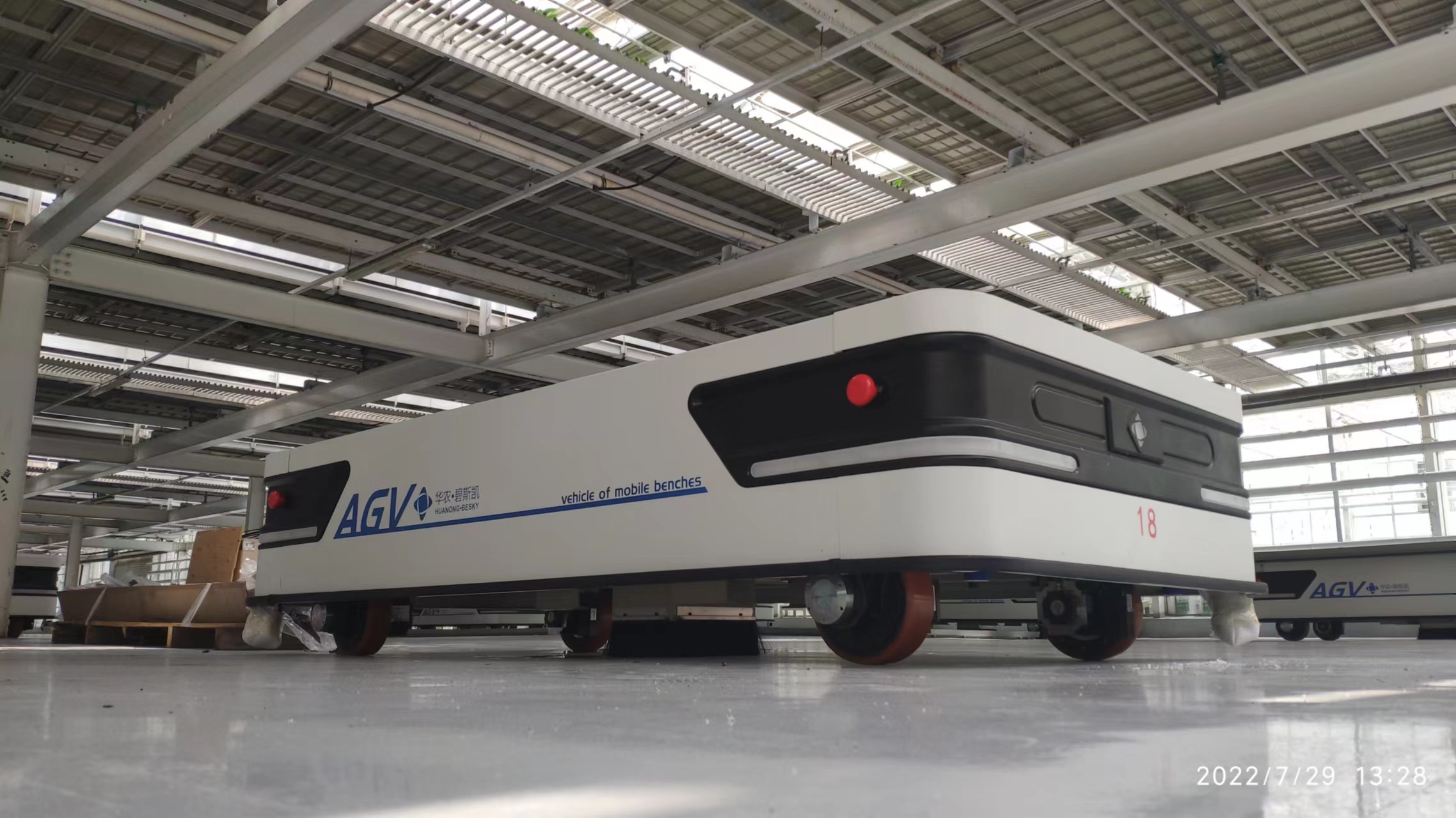 AGV苗床背负式运输车是专为物流苗床研发的一款运输装备。采取可升降的背负式运输。最大举升重量2吨,最高运动速度1米/秒,车辆装有三层防碰撞系统及激光雷达防碰撞系统,保障人、车、货安全。车辆可无缝对接电动升降门,花盆跳移机、自动回充桩等设备。