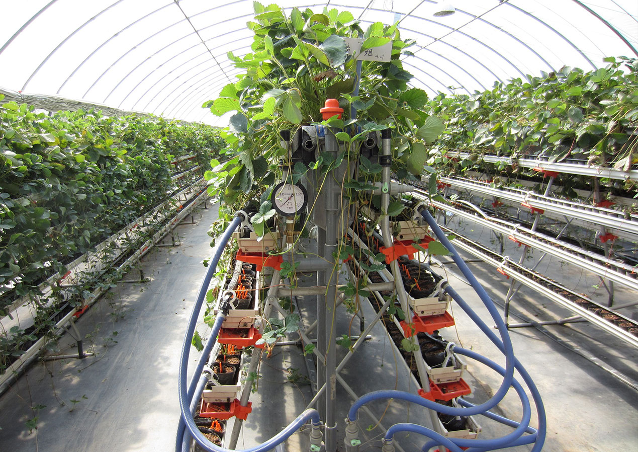 以镀锌管件为受力载体,将母株苗置于结构顶端,子苗盘成阶梯式分层放置,且对称布置于支架两侧,是一种能最大限度提高土地利用率,改善作业舒适度、提高经济效益以及最大限度利用温室空间和太阳光照的新型草莓育苗装置。