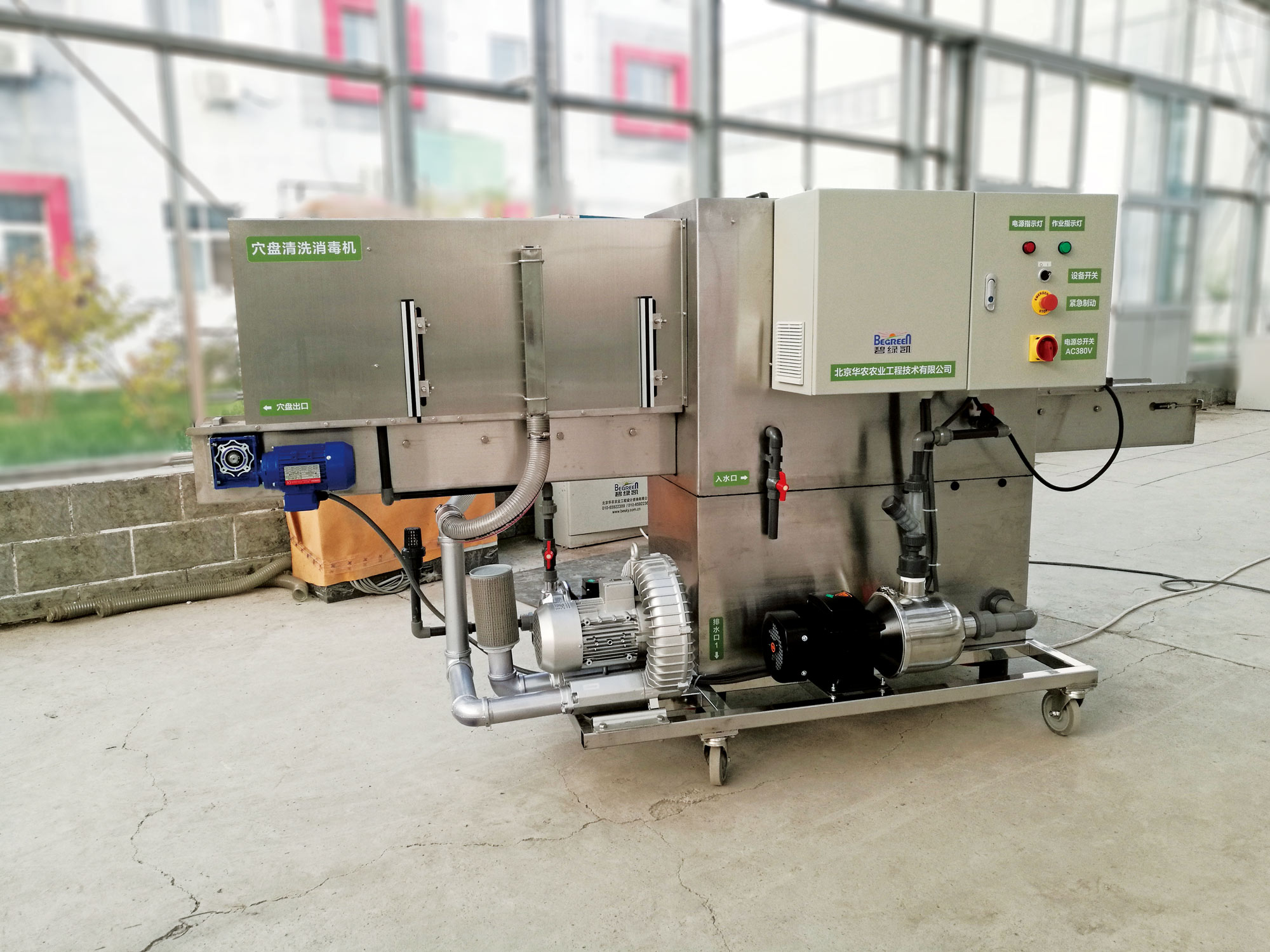 装备专门用于穴盘清洗和消毒,采用不锈钢 结构清洗槽,适合多种尺寸范围的育苗容器, 清洗时间可设定。清洗系统包括穴盘喂入、 穴盘清洗、穴盘消毒和清洗污水过滤循环等 作业环节。清洗速度可通过变速器调节,清 洗室设有旋转高压喷水嘴,清洗水流由多级 离心泵增压,洗涤水通过不锈钢过滤网过滤 后流入回收底槽循环使用。