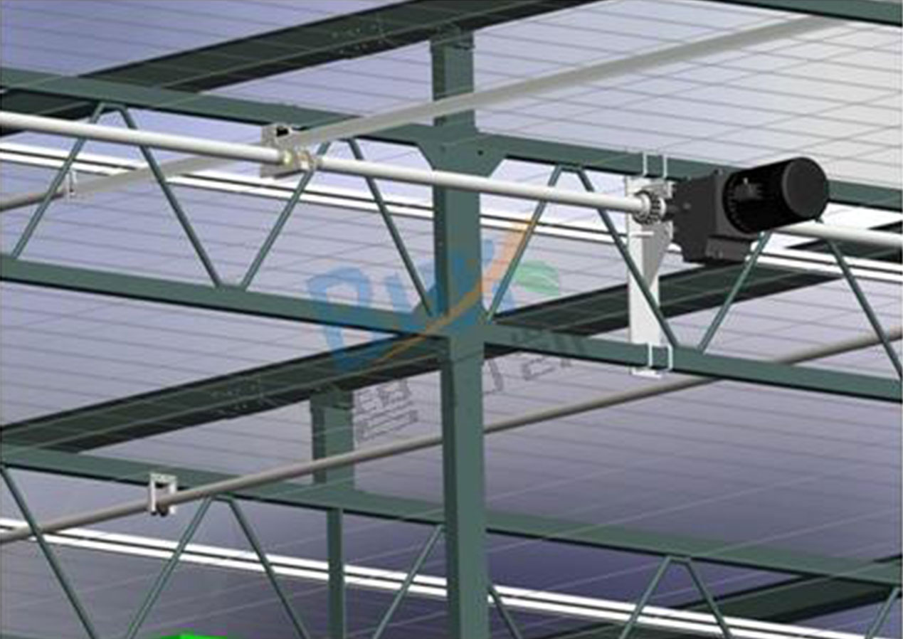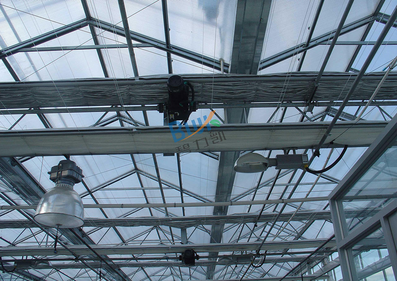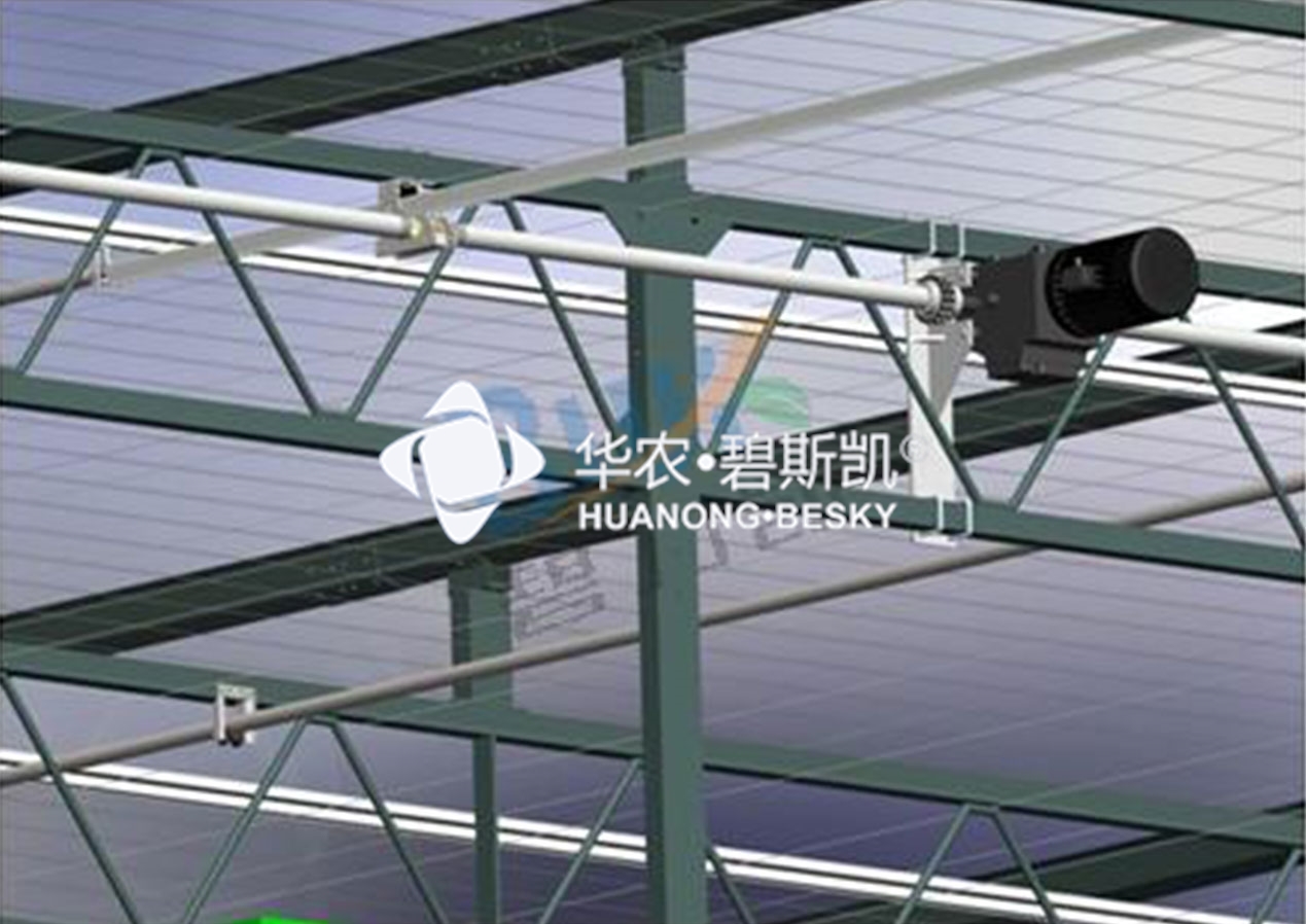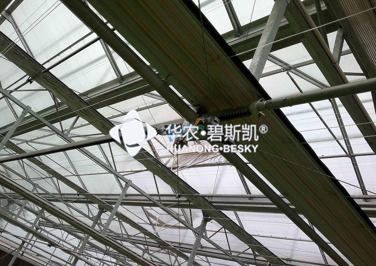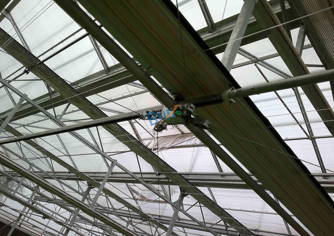 在拉幕齿轮齿条、电机及其配件的共同作用下,进行幕布的启闭操作。此类系统运行平稳,行走准确,密封性好,适用于面积大,控制精度高,对系统密封性要求高的温室。