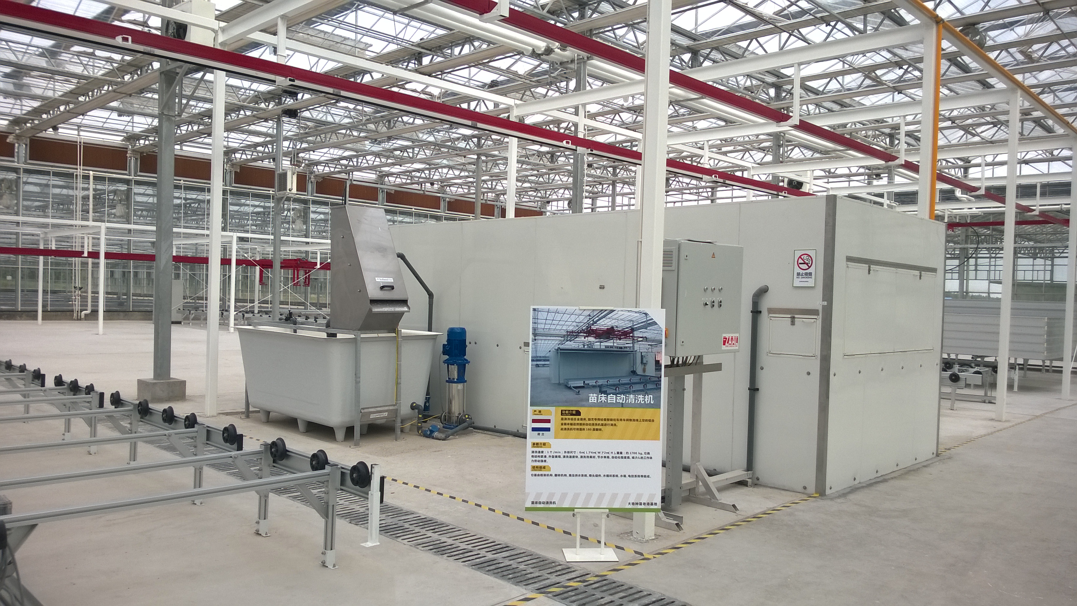 苗床清洗消毒机主要用于清洗带有种植盘的铝合金苗床,可与轻载天车配合实现种植床循环利用。该 设备结构紧凑、外型美观、清洗速度快、清洗效果好、节水率高、自动化程度高、减少劳动强度。