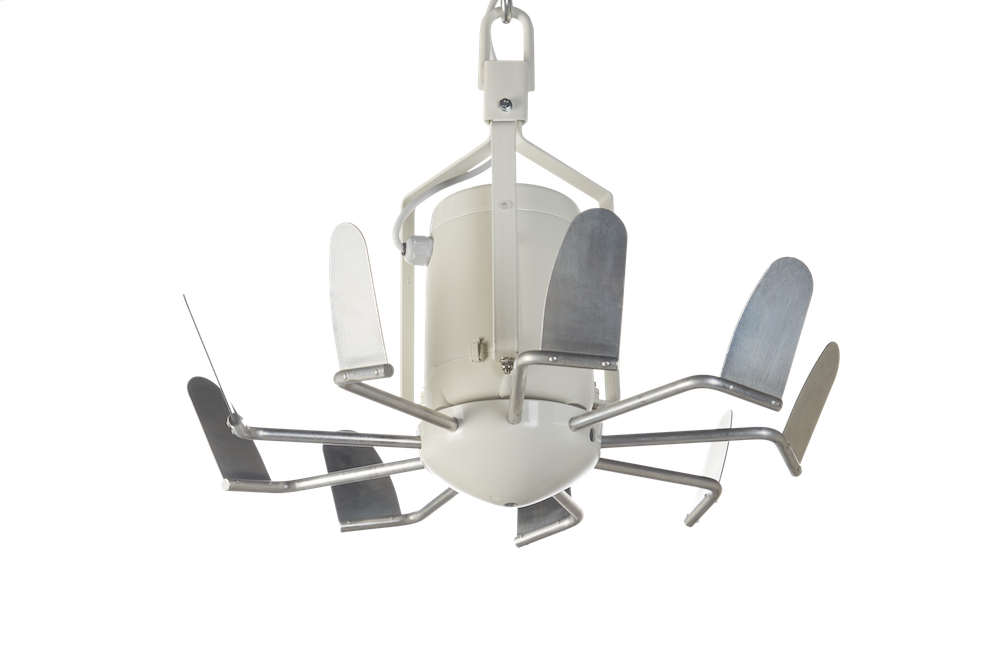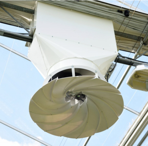 吸入温室内幕布上方干燥的空气并通过输出盘将空气水平分散并充分混合。