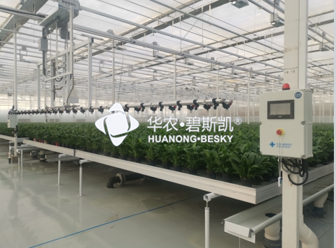 智远喷灌机轨道固定在温室桁架下方,喷灌机沿固定轨道自动往复运行。以微喷形式对作物进行精准灌溉、施肥、打药等作业。单向灌溉行程可达200米、空间利用充分,自动化程度高。可以安装在各种温室环境中,尤其适合开间方向长度超过80米的大型连栋温室。