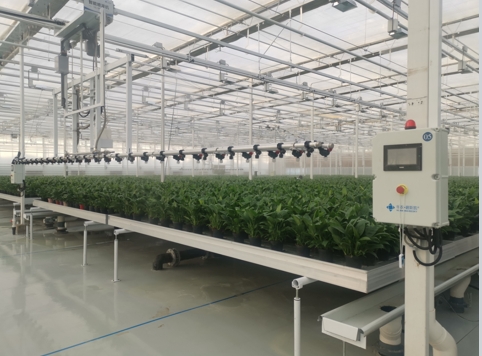 智远喷灌机轨道固定在温室桁架下方,喷灌机沿固定轨道自动往复运行。以微喷形式对作物进行精准灌溉、施肥、打药等作业。单向灌溉行程可达200米、空间利用充分,自动化程度高。可以安装在各种温室环境中,尤其适合开间方向长度超过80米的大型连栋温室。